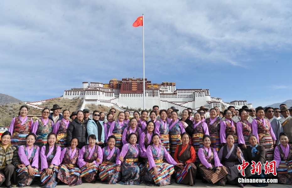 3月28日,西藏各族各界人士聚集在拉薩布達拉宮廣場,升國旗、唱國歌,參加西藏百萬農(nóng)奴解放65周年紀念活動。圖為民眾身著盛裝在布達拉宮廣場留影。中新社記者 貢嘎來松 攝
