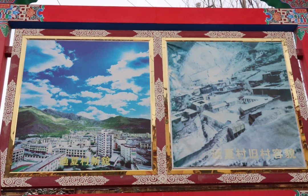 而在通夏村門口,兩幅照片十分顯眼,一幅是通夏村新貌,一幅是舊貌。在舊貌中,低矮的土平房在大雪積壓下,東零西落地散布在起起伏伏的坡面上,冰雪覆蓋的泥濘小道幾乎無法通行?!斑@樣的土坯房我和先輩們住了幾十年,更早以前,甚至都沒有房子,放牧到哪里,帳篷就支到哪里?!苯衲?3歲的村民達(dá)瓦扎巴指著老照片說。而在一旁新貌圖中,蔚藍(lán)的天空下一幢幢藏式小樓整齊林立,寬敞的水泥路通家達(dá)戶,一派欣欣向榮的景象……