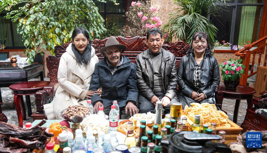 孫女索朗曲珍、朗杰(左二)、二兒子尼瑪和二兒媳次旦卓嘎在家中合影(3月13日攝)。新華社記者 晉美多吉 攝