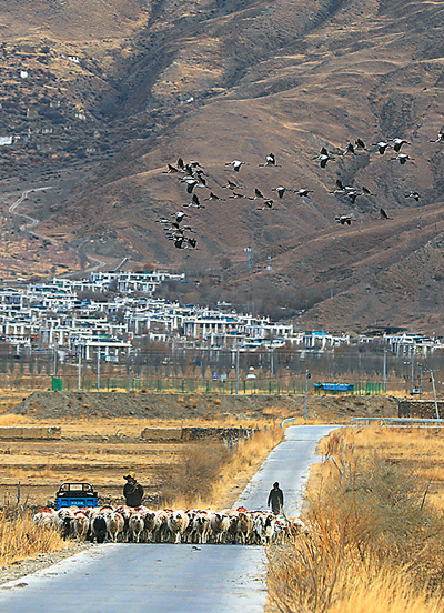 黑頸鶴群飛過西藏山南市貢嘎縣杰德秀鎮(zhèn)村莊和羊群。益西旦增攝