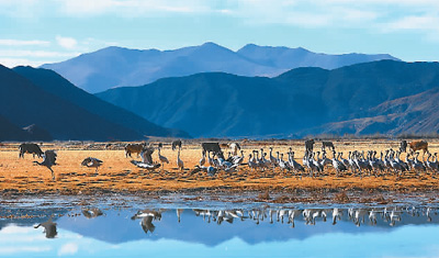 黑頸鶴和其他動(dòng)物正在西藏日喀則市拉孜縣曲瑪鄉(xiāng)的草地里覓食。瓊達(dá)卓嘎、益西旦增攝