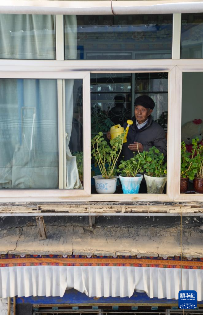 洛桑貢布在自家二樓陽臺澆花(3月27日攝)。
