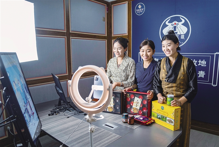 網(wǎng)絡(luò)主播在巴青縣“赤堆東雄”網(wǎng)紅直播間推介當(dāng)?shù)靥厣r(nóng)牧產(chǎn)品。 新華社記者 孫非 攝