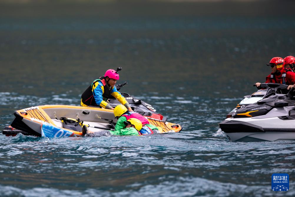 4月20日,救援人員在兩人漂流艇競(jìng)速賽比賽中救起落水的“漂流雜多”隊(duì)選手。新華社記者 姜帆 攝