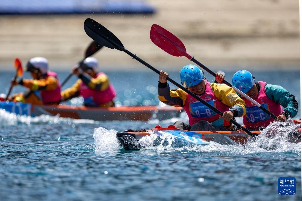 4月20日,“朝陽戰(zhàn)隊(duì)”選手張秀聰(右一)、張杰(右二)在兩人漂流艇競(jìng)速賽比賽中。新華社記者 姜帆 攝