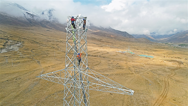 圖為工作人員在拉薩市林周縣色康村開展拉薩500千伏輸變電工程組塔作業(yè)。記者 格桑倫珠 攝