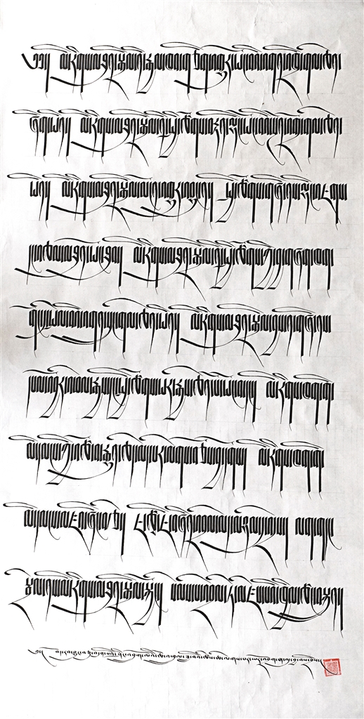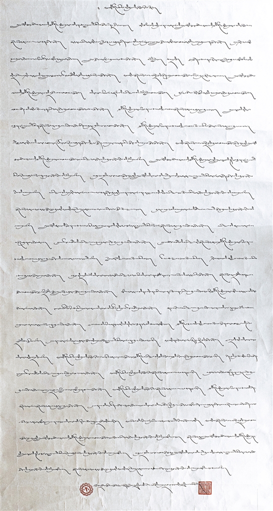 藏文書法一等獎(jiǎng)作品《在黨的民族政策光輝照耀下各族人民繁榮發(fā)展》。作者 索朗歐珠