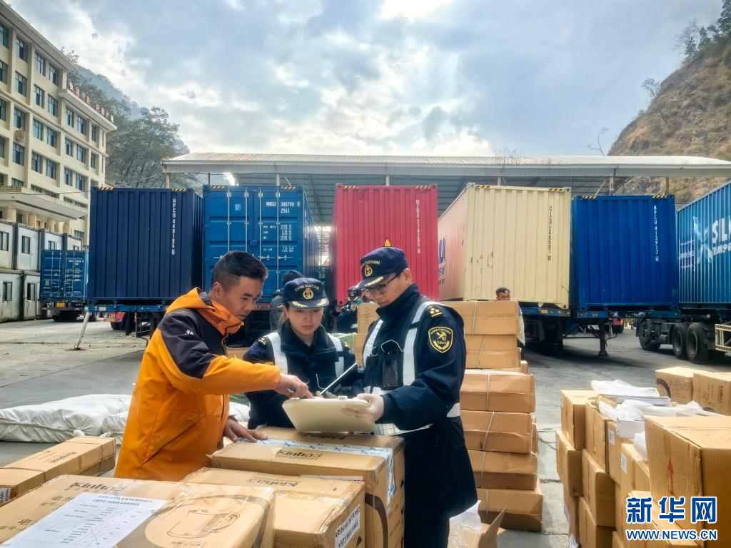 拉薩海關(guān)所屬聶拉木海關(guān)工作人員監(jiān)管進出口貨物。(拉薩海關(guān)供圖)