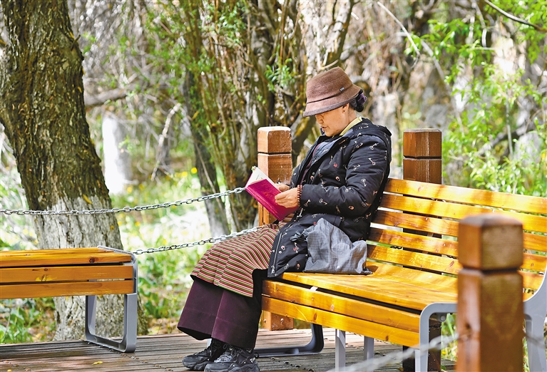 5月3日,一位群眾在拉魯濕地閱讀。記者 旦增蘭澤 攝