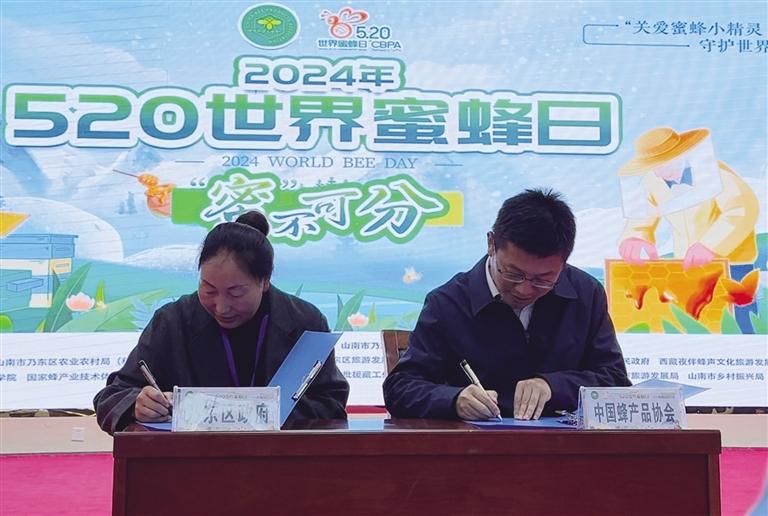 中國蜂產(chǎn)品協(xié)會領(lǐng)導(dǎo)與乃東區(qū)政府副區(qū)長宗巴(左)簽署共建“西藏山花蜂蜜之鄉(xiāng)”協(xié)議。記者 旦增玉珍 攝