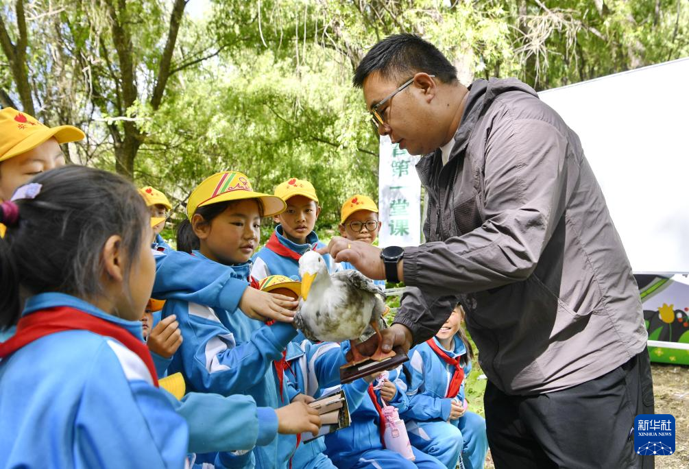 5月22日,西藏大學(xué)生態(tài)環(huán)境學(xué)院助理實驗師朱文琎向小學(xué)生展示鳥類標本。新華社記者 張汝鋒 攝