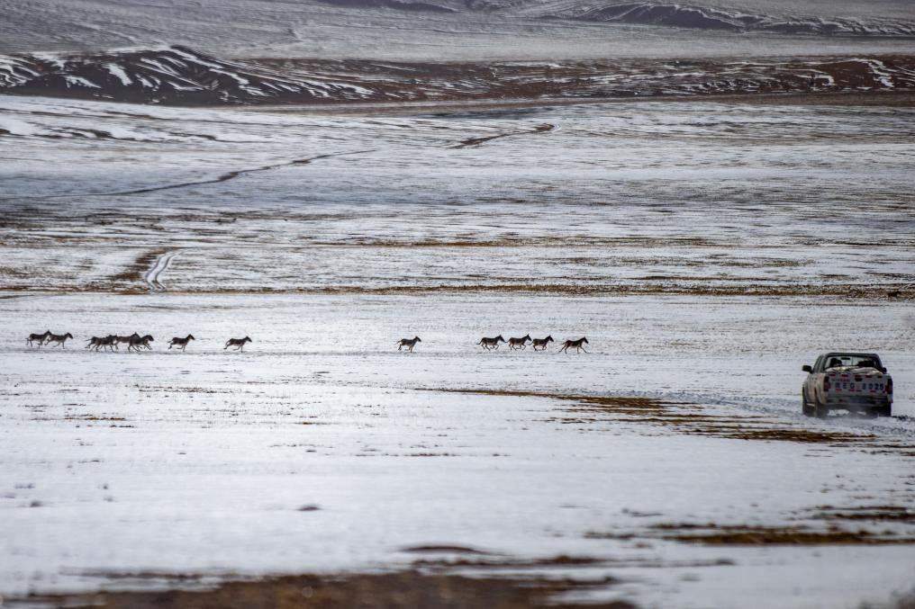 成群的藏野驢從野生動(dòng)物專業(yè)管護(hù)隊(duì)員們的車前跑過(5月9日攝)。新華社記者 姜帆 攝