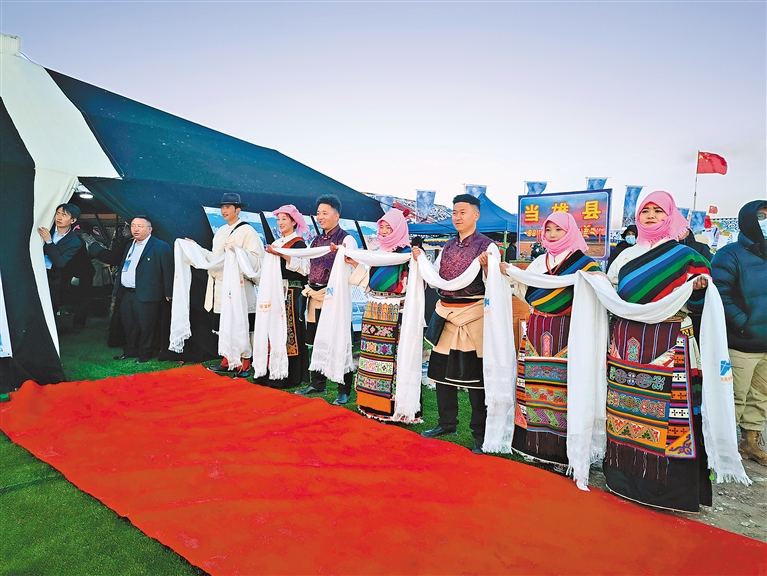 開湖意味著旅游旺季的到來。當(dāng)雄縣、尼木縣、曲水縣、城關(guān)區(qū)等縣區(qū)都搭起彩色帳篷,展示特色美食、文創(chuàng)產(chǎn)品和非遺文化。各縣區(qū)的文旅局長們集體“出攤”,向來賓做著熱情細(xì)致的宣介。林周縣的帳篷前,4位藏族農(nóng)牧民跳起舞蹈,這是從夯墻勞作中誕生的傳統(tǒng)舞蹈“阿嘎舞”;達孜區(qū)展出青稞精釀白啤酒、以黑頸鶴為靈感創(chuàng)作的文創(chuàng)產(chǎn)品、知名品牌的古檀香等特色商品;曲水縣在醒目位置放置著全域旅游手繪地圖、文旅產(chǎn)業(yè)招商引資項目介紹等手冊。
