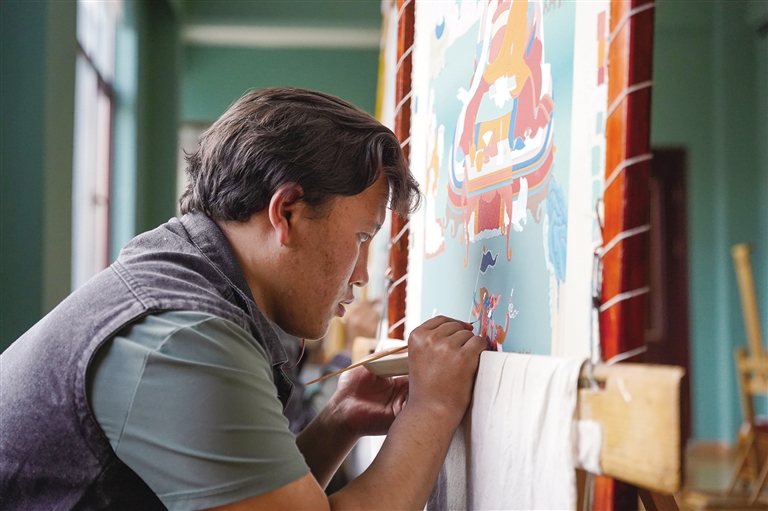 夏日午后,記者驅車抵達西藏嘎欽唐卡畫院。在這里,我們見到了昌都嘎瑪嘎赤畫派的傳承人羅珠巴松,他給人的第一印象是斯文靦腆。然而,更令人驚訝的是,眼前這位年輕的唐卡畫師已經被認定為國家級非遺傳承人——今年2月,文化和旅游部公示了第六批國家級非物質文化遺產代表性傳承人推薦人選名單,羅珠巴松作為藏族唐卡(昌都嘎瑪嘎赤畫派)的代表性傳承人入選。