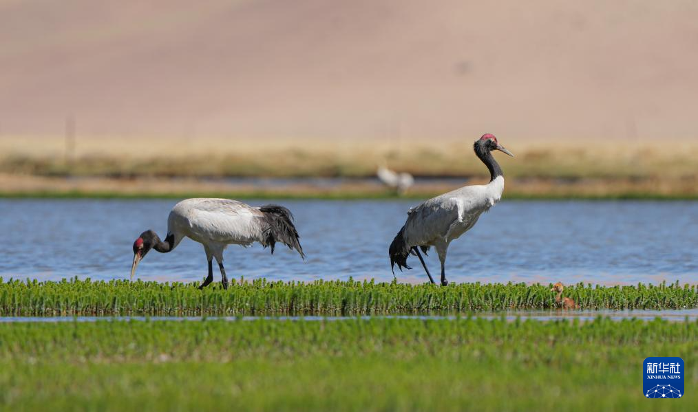 6月9日,一對黑頸鶴夫婦帶著雛鳥在西藏那曲市申扎縣一處濕地棲息、覓食。新華社記者 姜帆 攝