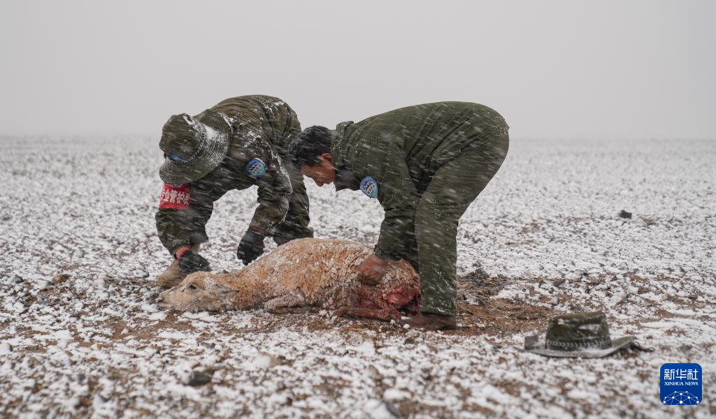 6月14日,西藏那曲市尼瑪縣境內(nèi)的羌塘國家級自然保護區(qū)“無人區(qū)”深處,在野生動物專業(yè)管護隊臨時宿營地附近,一只在藏羚羊遷徙路上等候已久的野狼撲向遷徙的藏羚羊群中一只懷孕的母羊,咬向肚子和脖子。激烈掙扎的藏羚羊掙脫后,靠著最后的一點力氣跑向野保隊營地,野狼不敢靠近營地而不得不離去。野保隊員看到在風雪中掙扎的母羊,把它運回營地進行救助。但由于傷勢太重,肚皮被咬開且內(nèi)臟嚴重受損,野保隊員只能將母羊的肚皮縫上之后,按照慣例將受傷的母羊抬放在羌塘大草原。