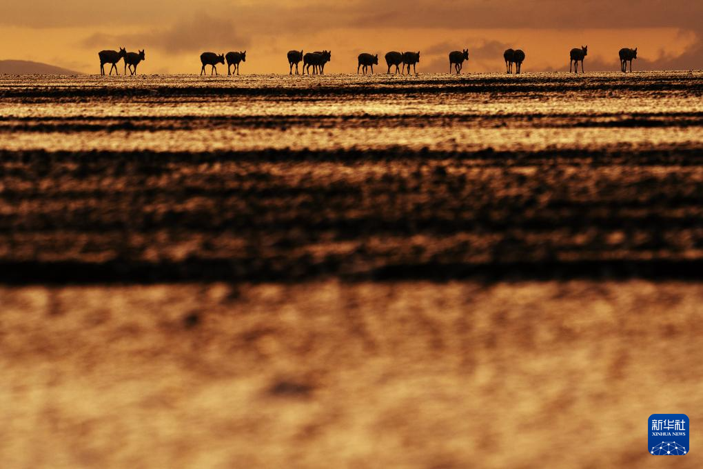 6月14日,在西藏那曲市尼瑪縣境內(nèi)的羌塘國家級自然保護區(qū)“無人區(qū)”深處,一群藏羚羊迎著朝陽,行進在遷徙路上。新華社記者 費茂華 攝