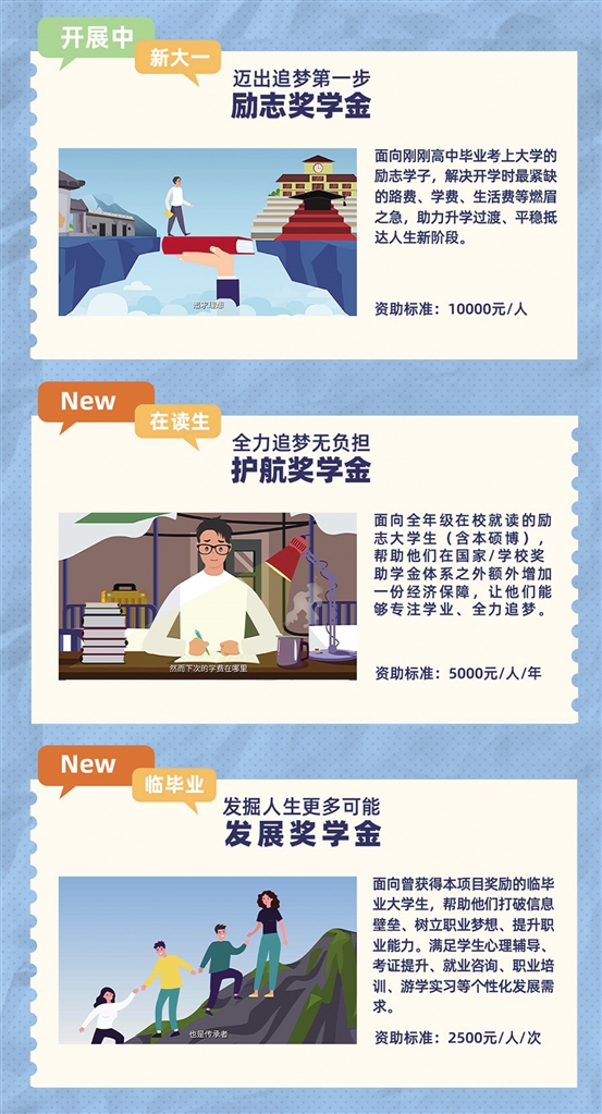 今年高考分數(shù)揭曉在即,項目升級為“夢想+”大學生助力計劃,除繼續(xù)重點獎勵剛考上大學的勵志新生每人1萬元“勵志獎學金”外,之后學生在本碩博直到臨畢業(yè)期間,如有困難仍可繼續(xù)申請“護航獎學金”(5000元/人/年)和“發(fā)展獎學金”(2500元/人/次)。為了能夠讓更多學子獲得獎學金,今年項目繼續(xù)聯(lián)合杭州嘉互助學基金會開通公募渠道,公募款將100%用于獎勵勵志學子。