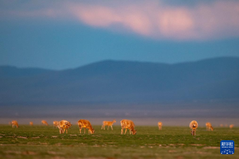 夕陽下,母藏羚羊在魯確塘草原上活動(6月16日攝)。新華社記者 晉美多吉 攝