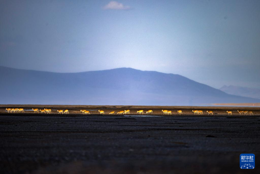 落日余暉中大群遷徙的藏羚羊行進(jìn)在甜水河畔的荒灘上(6月13日攝)。新華社記者 姜帆 攝