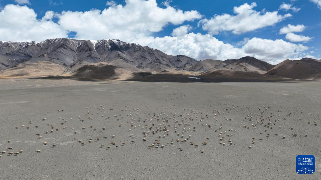 大群遷徙的藏羚羊在羌塘保護(hù)區(qū)核心區(qū)向產(chǎn)羔地遷徙(6月13日攝,無人機(jī)照片)。新華社記者 晉美多吉 攝