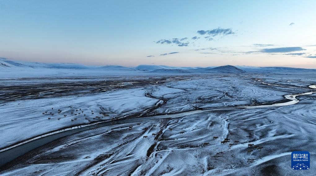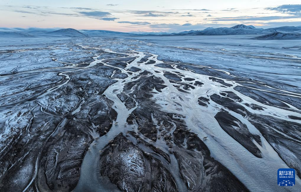 這是在甜水河畔荒灘雪地中向產(chǎn)羔地遷徙的藏羚羊(6月15日攝,無人機(jī)照片)。新華社記者 晉美多吉 攝