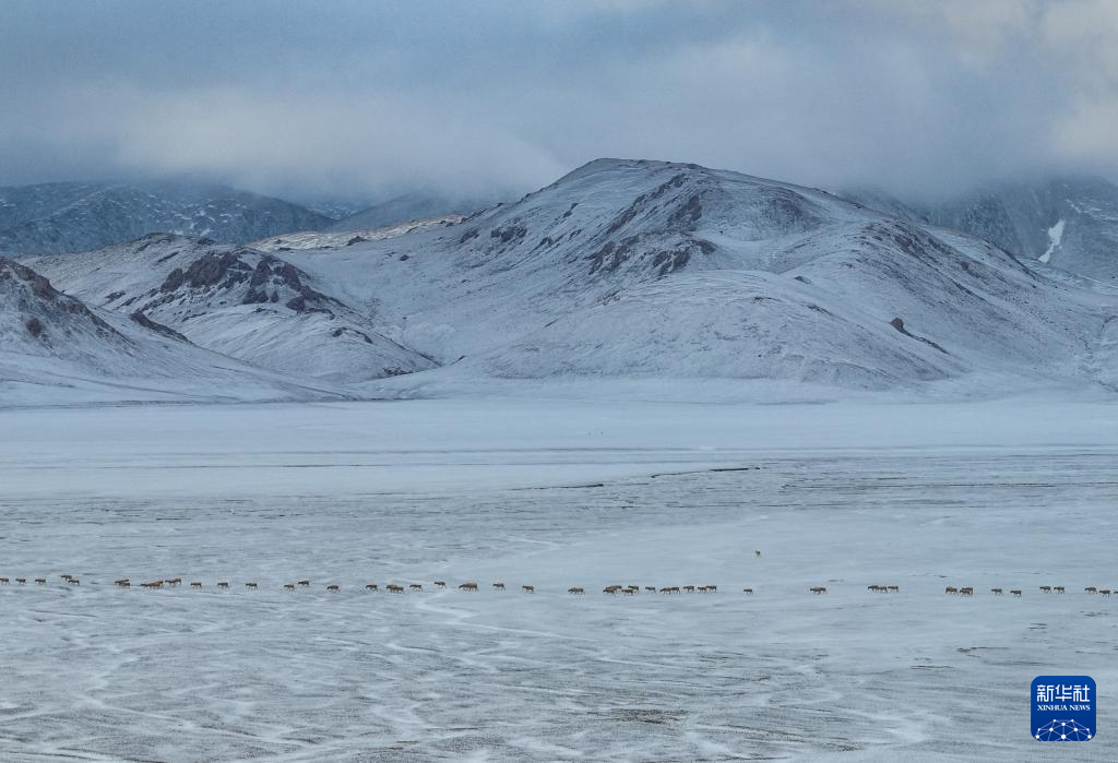 大群遷徙的藏羚羊翻越覆蓋著積雪的山梁(5月10日攝)。新華社記者 姜帆 攝