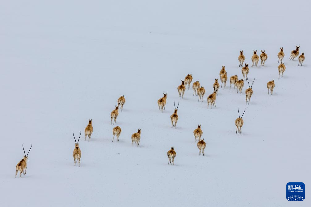 這是雪地中遷徙的藏羚羊(5月8日攝)。新華社記者 丁增尼達(dá) 攝