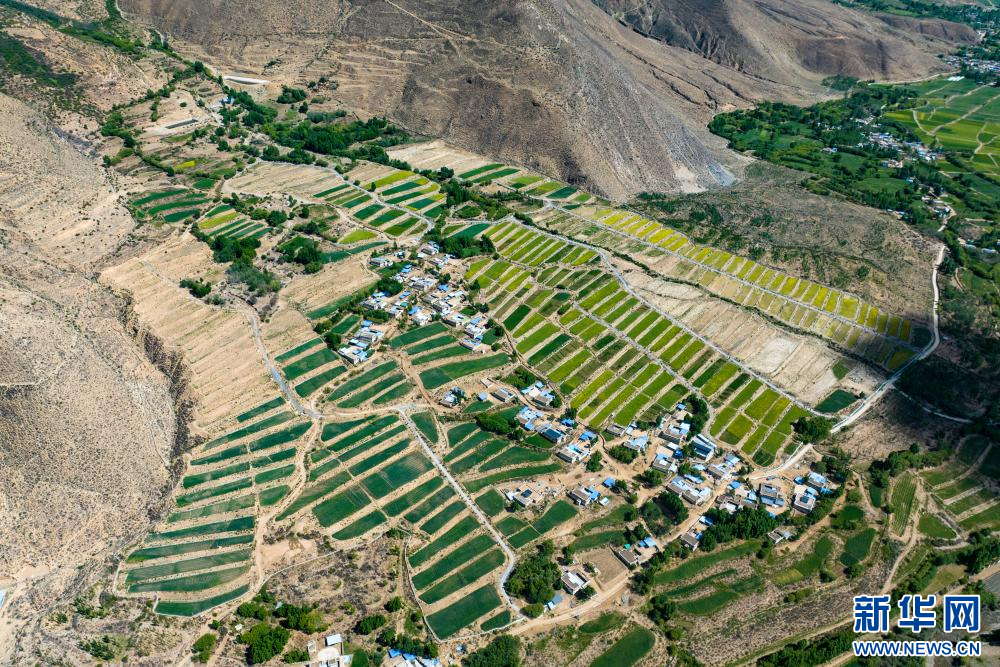 6月21日在西藏山南市乃東區(qū)境內(nèi)拍攝的田園風(fēng)光(無(wú)人機(jī)照片)。新華網(wǎng) 旦增努布 攝
