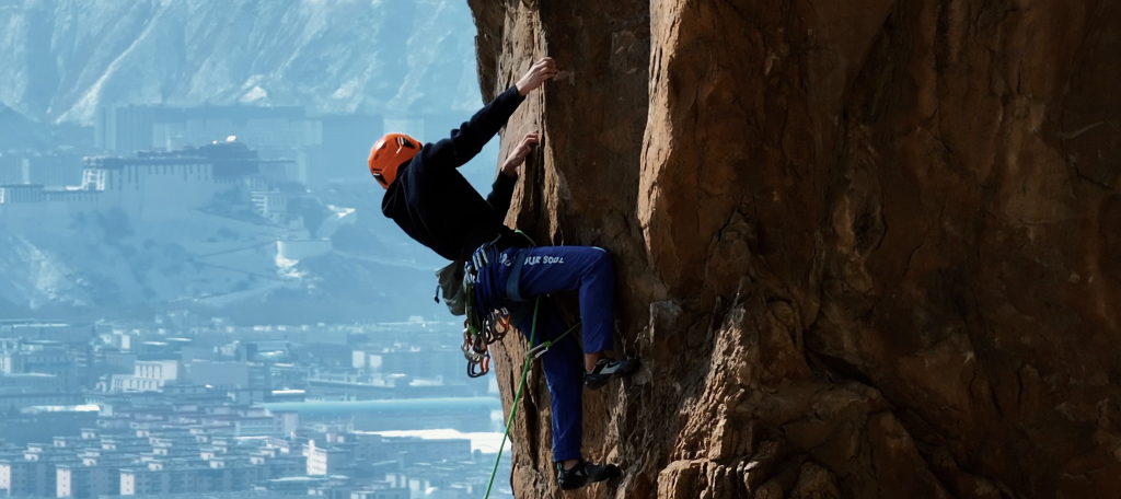 穆澤潤在拉薩的自然巖壁上攀巖