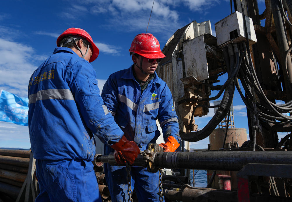 7月11日,鉆探隊(duì)隊(duì)員在準(zhǔn)備增加孔內(nèi)鉆桿。新華社記者 晉美多吉 攝