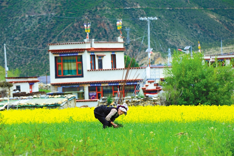 墨竹工卡縣扎雪鄉(xiāng)龍珠崗村村民在田里拔草。