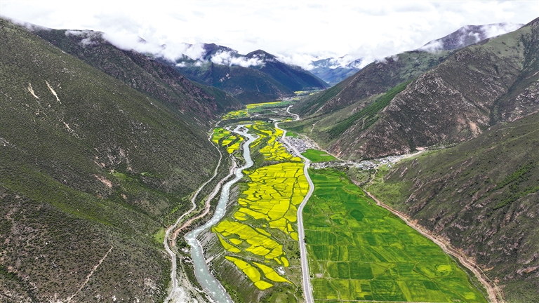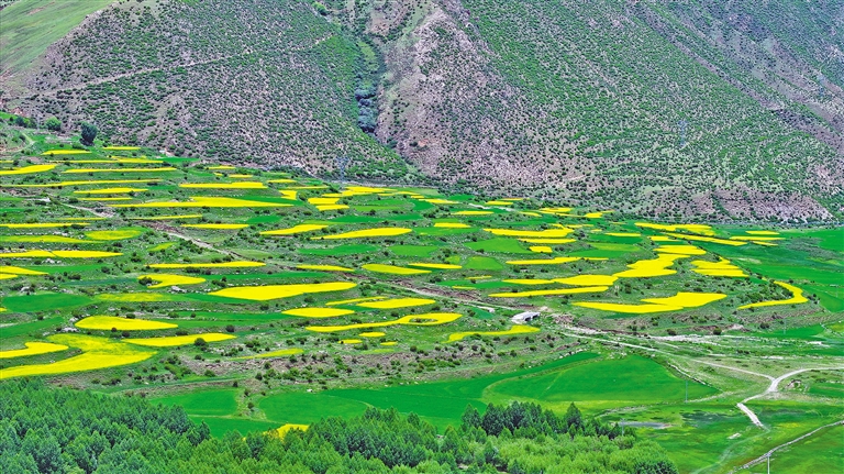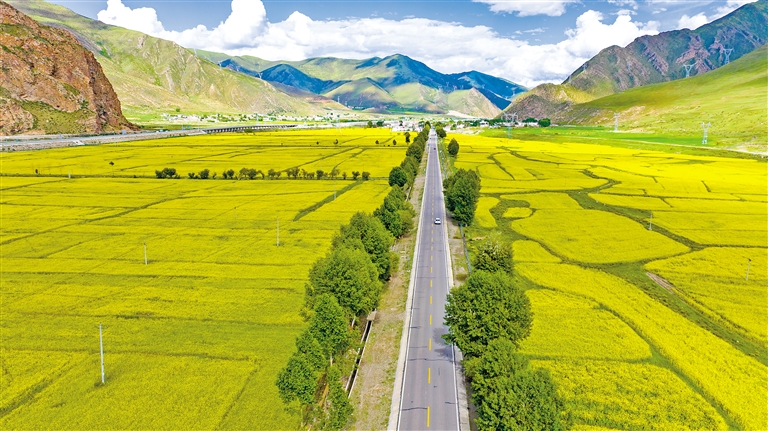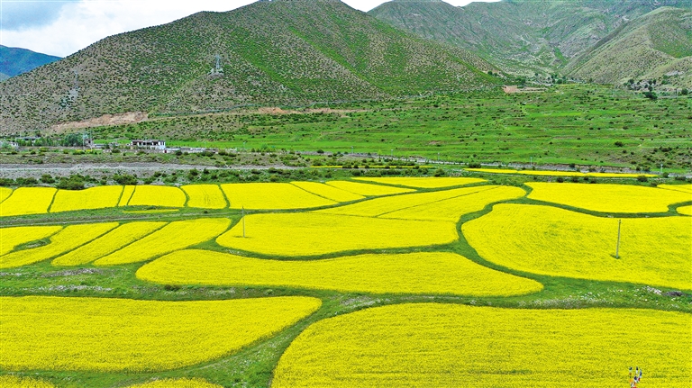 最近,墨竹工卡縣迎來(lái)了油菜花的盛開(kāi)時(shí)節(jié)。放眼望去,滿目的油菜花如同金黃色的毯子般鋪展開(kāi)來(lái),在微風(fēng)中搖曳,散發(fā)出迷人的香氣。一團(tuán)團(tuán)、一簇簇的金黃色花朵點(diǎn)綴在田野上,流動(dòng)著濃濃夏意。成片的花海與蜿蜒的農(nóng)村公路、錯(cuò)落有致的村居共同構(gòu)成了一幅和諧美麗的田園風(fēng)景圖。