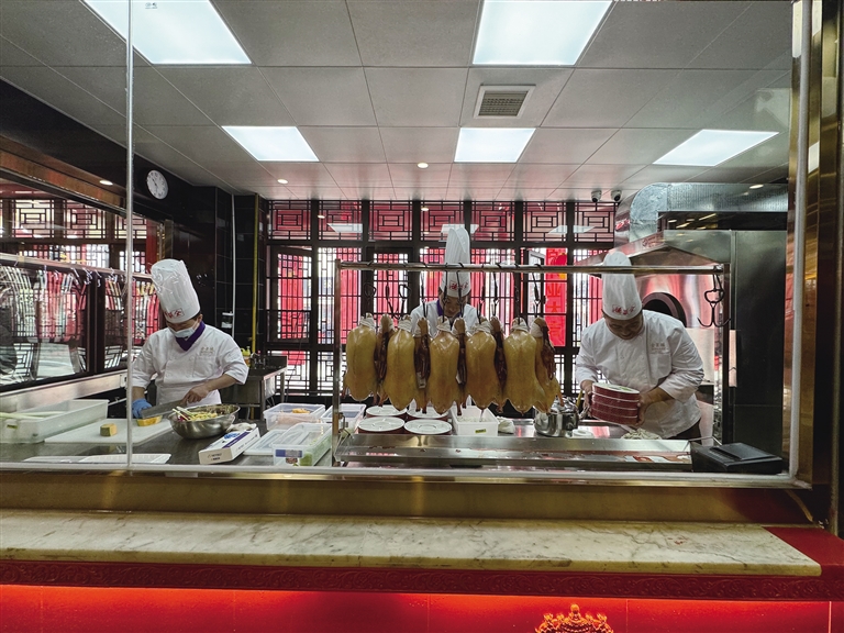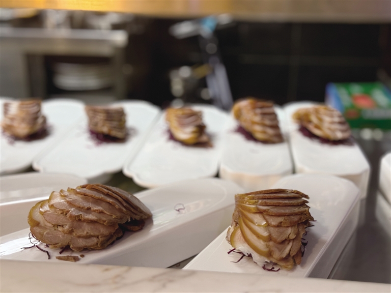 全聚德拉薩店選址于仙足島濱河路二期,店鋪設計匠心獨運,將古樸典雅的外部風貌與簡約優(yōu)雅的現(xiàn)代內部裝飾巧妙融合。墻壁上隨處可見的掛畫在介紹著店鋪歷史的同時,更為空間增添了一抹藝術氣息。開業(yè)當天,隨著歡快的開場舞響起,慶典活動正式拉開帷幕?,F(xiàn)場,片鴨師傅們以精湛的技藝展示著全聚德的獨特魅力,一只只色澤誘人的烤鴨在他們的巧手下化身為薄如蟬翼的鴨肉片,搭配新鮮的蔥絲、黃瓜條及特制甜面醬卷入薄餅中,一口咬下,鮮美與香甜在口中瞬間綻放,令人回味無窮。