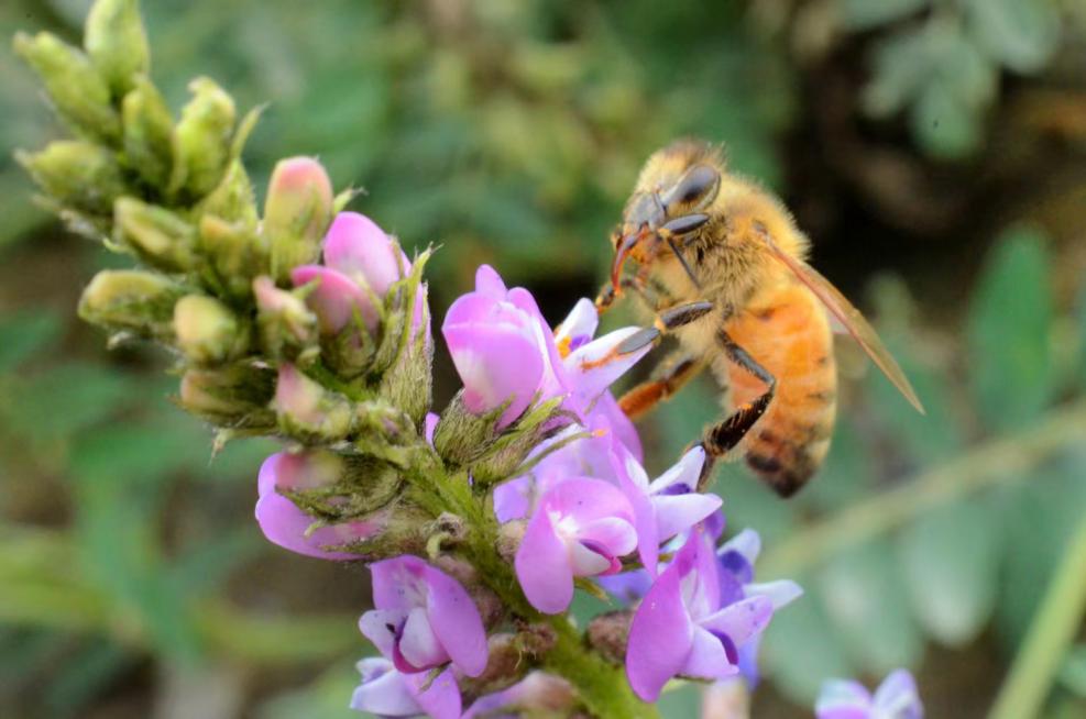 蓊郁山谷中,清澈的泉水汩汩流淌。一株藏黃芪的花蕊上,一只小蜜蜂正在靈活敏捷地采集花粉。