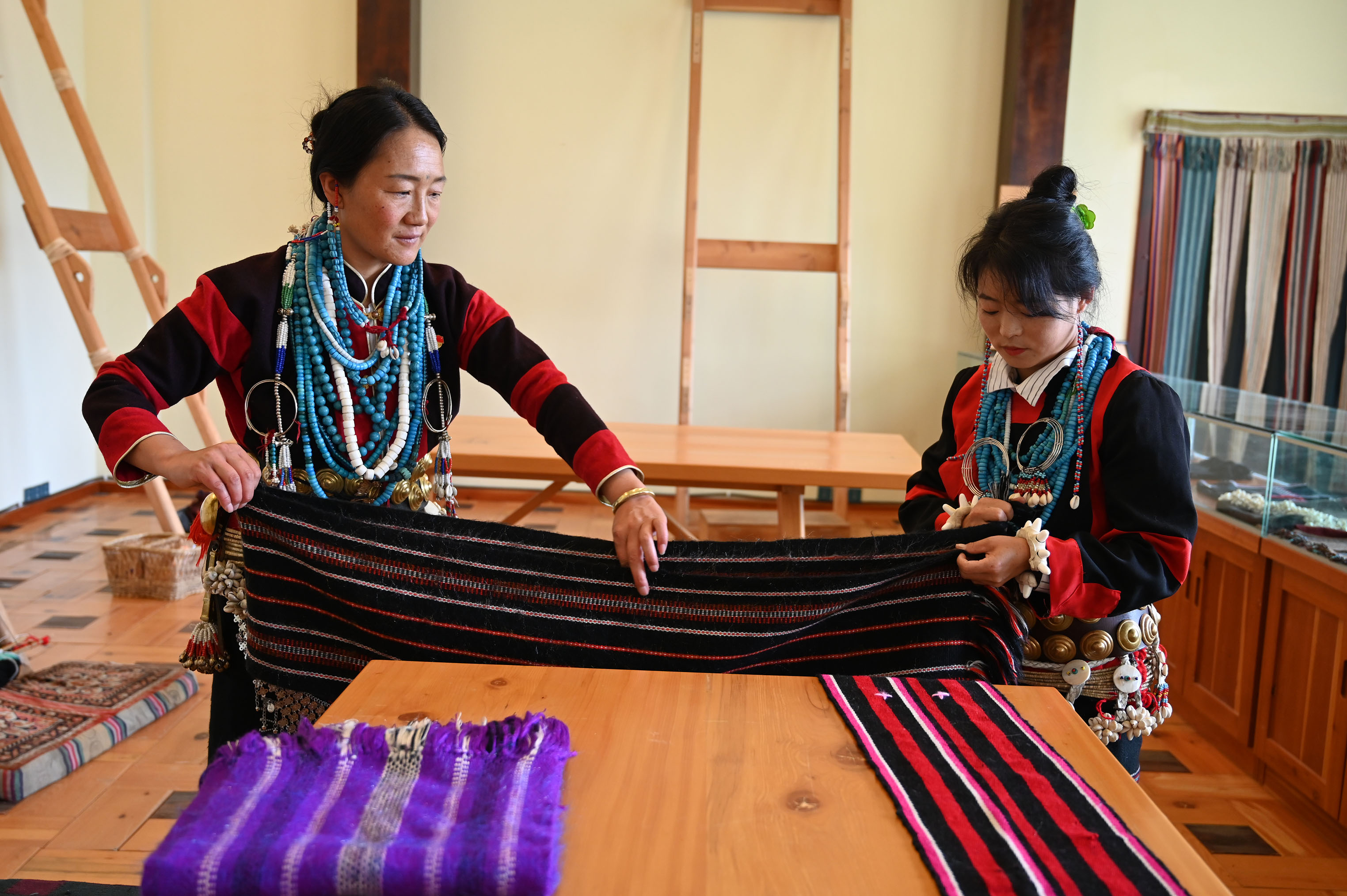 七月的林芝米林市南伊洛巴民族鄉(xiāng)才召村,干凈整潔的村道旁,家家戶戶門前的月季、玫瑰、格?;▼善G綻放。走進(jìn)米林珞巴族織布服飾加工傳習(xí)所,“幸福是奮斗出來的”8個(gè)紅字映入眼簾。圍巾、挎包、餐墊、毯子、珞巴服飾等10余種手工編織品有序擺放在玻璃柜里。村婦聯(lián)主席亞達(dá)兒正帶領(lǐng)7名婦女坐在織布架前編織桌旗、餐墊和毛毯等。