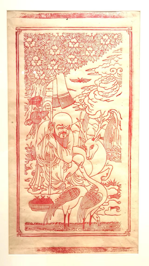 雕版拓片《六長(zhǎng)壽》,印有長(zhǎng)壽巖、長(zhǎng)壽老人、長(zhǎng)壽水、長(zhǎng)壽樹(shù)、長(zhǎng)壽鶴、長(zhǎng)壽鹿六樣元素,是西藏經(jīng)典的風(fēng)俗畫題材,其中長(zhǎng)壽老人還有內(nèi)地壽星形象的標(biāo)志性凸額。由于寓意吉祥,它出現(xiàn)在唐卡、家用藏式柜彩畫以及布達(dá)拉宮的壁畫上。