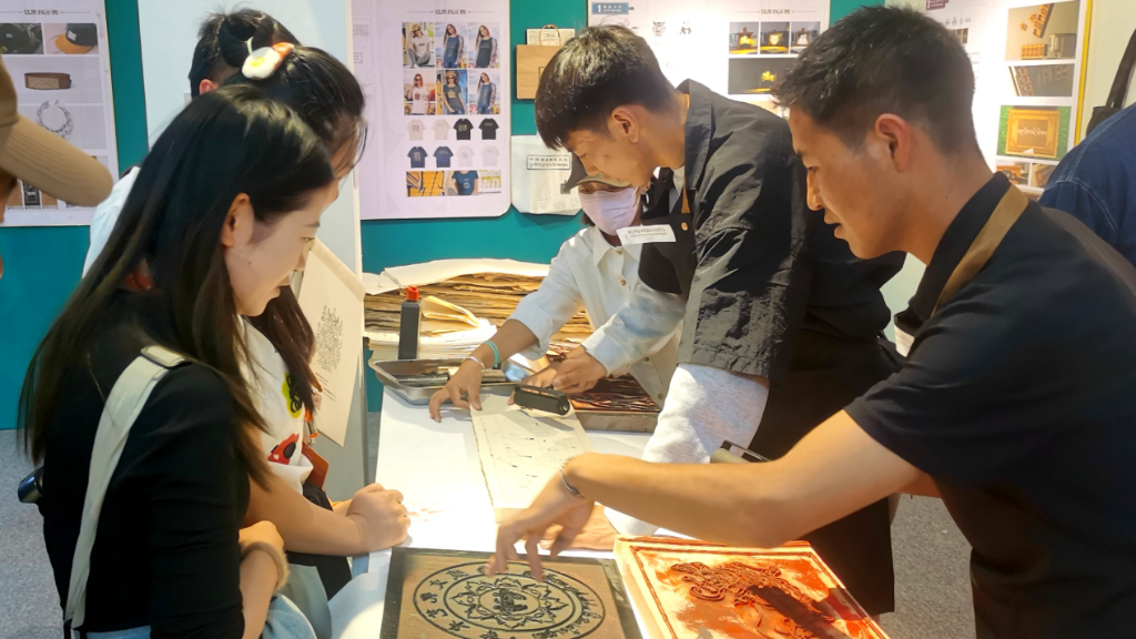 在文創(chuàng)區(qū),雕版被玩得“腦洞大開(kāi)”。一組搶眼的提燈,燈面是矢量處理的拓片圖案,它帶手柄的木框正是西藏雕版的傳統(tǒng)形狀。手機(jī)殼、鑰匙扣、文化衫和帆布包也印刻上雕版圖案,連同親手完成的拓片一起,成為“帶得走”的“文物”。