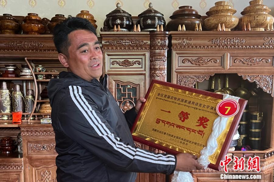 “這是我去年獲得的西藏自治區(qū)首屆農(nóng)牧民國家通用語言文字演講比賽一等獎(jiǎng),我當(dāng)時(shí)演講的主題就是民族團(tuán)結(jié)?!痹诹种ユ?zhèn)嘎拉村黨支部宣傳委員、村委會(huì)副主任尼瑪多吉家中,主人正自豪地向記者們展示著獲獎(jiǎng)牌匾。