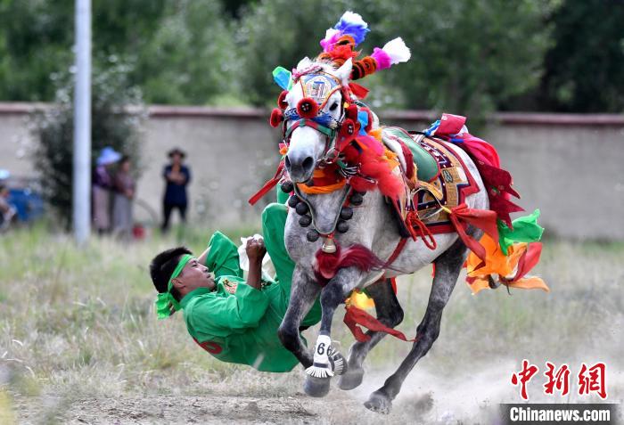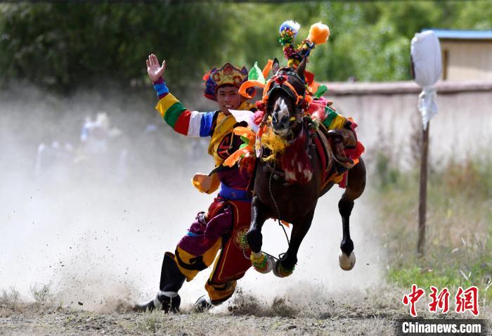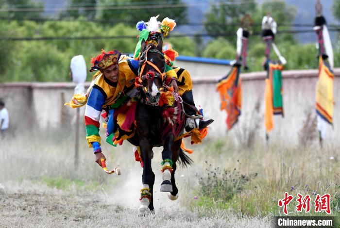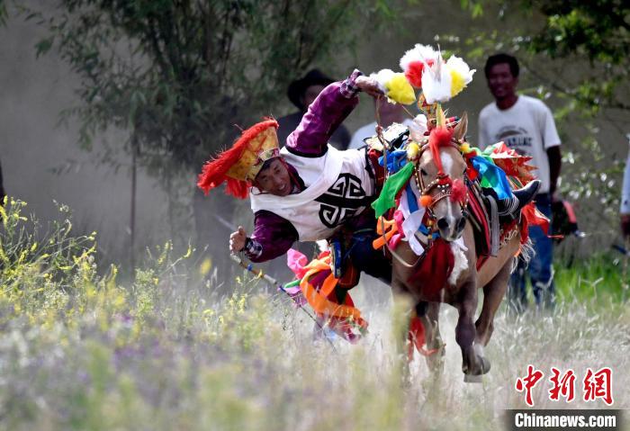 7月27日,西藏拉薩市桑達村迎來“望果節(jié)”,村民們舉行賽馬活動慶祝?!巴?jié)”是西藏傳統(tǒng)的豐收節(jié),具體日期隨各地莊稼成熟的時間而變化。“望果節(jié)”期間,按照習(xí)俗,各地都會舉辦賽馬比賽。圖為騎手進行馬術(shù)表演。中新社記者 李林 攝