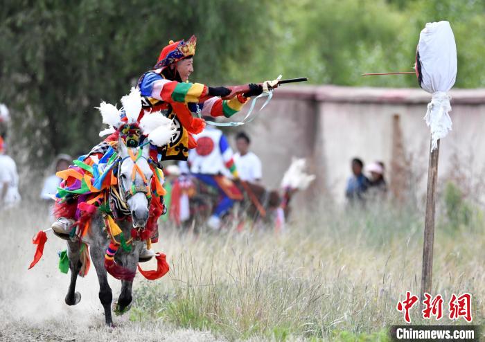 7月27日,西藏拉薩市桑達村迎來“望果節(jié)”,村民們舉行賽馬活動慶祝?!巴?jié)”是西藏傳統(tǒng)的豐收節(jié),具體日期隨各地莊稼成熟的時間而變化?!巴?jié)”期間,按照習(xí)俗,各地都會舉辦賽馬比賽。圖為騎手進行馬上射擊表演。中新社記者 李林 攝