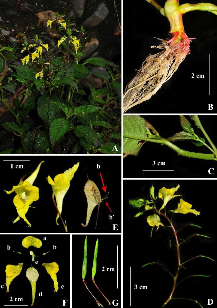 2022年,胡光萬研究員團隊在西藏隆子縣進行野外科考時發(fā)現(xiàn)一種獨特的鳳仙花,后經(jīng)形態(tài)比對和分子系統(tǒng)學分析,確定其為新物種,并將其命名為隆子鳳仙花。隆子鳳仙花與輻射鳳仙花在形態(tài)上最為接近,但隆子鳳仙花的莖、葉、葉柄和花梗上均被柔毛覆蓋,輻射鳳仙花全株無柔毛,兩者區(qū)別明顯。