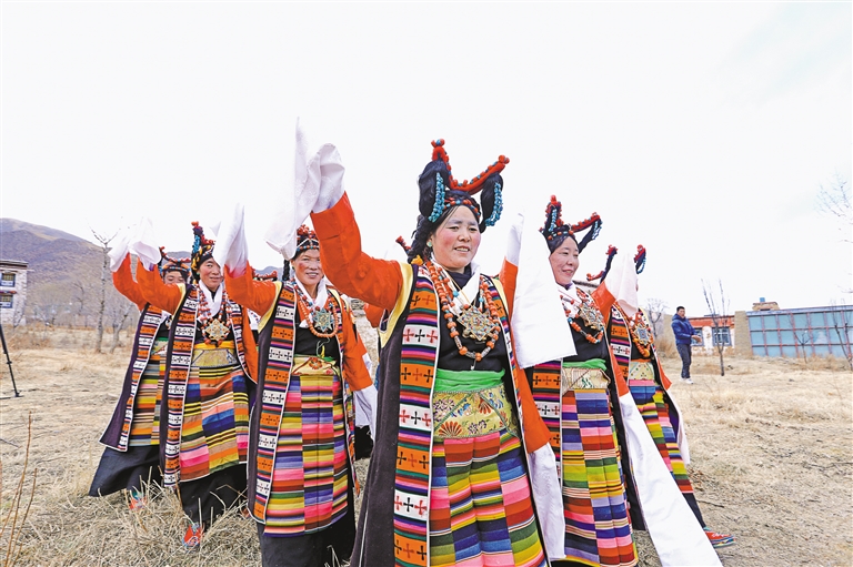 “如今,這支隊伍已發(fā)展到20多名成員,都是當?shù)厝罕?。藝術隊經(jīng)常受邀參加各種大小晚會、重要節(jié)日演出和赴區(qū)內(nèi)外非遺展演等,其影響力和傳播力不斷提升,特別是甲瑪諧欽《和親路》受到廣泛歡迎?!奔赚斷l(xiāng)工作人員德吉卓嘎說。