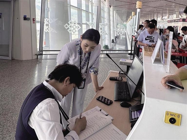 日常工作中,達(dá)娃曲珍也會(huì)發(fā)揮自己的語言優(yōu)勢(shì),為藏族旅客提供幫助?!坝行┘亦l(xiāng)人確實(shí)不太會(huì)講普通話,用方言進(jìn)行交流會(huì)讓他們覺得很親切,溝通過程也會(huì)順暢很多?!边_(dá)娃曲珍還主動(dòng)學(xué)習(xí)英語,掃清與外國游客的溝通障礙。常用服務(wù)用語的熟練掌握,為她更好地服務(wù)旅客打下了堅(jiān)實(shí)基礎(chǔ)。