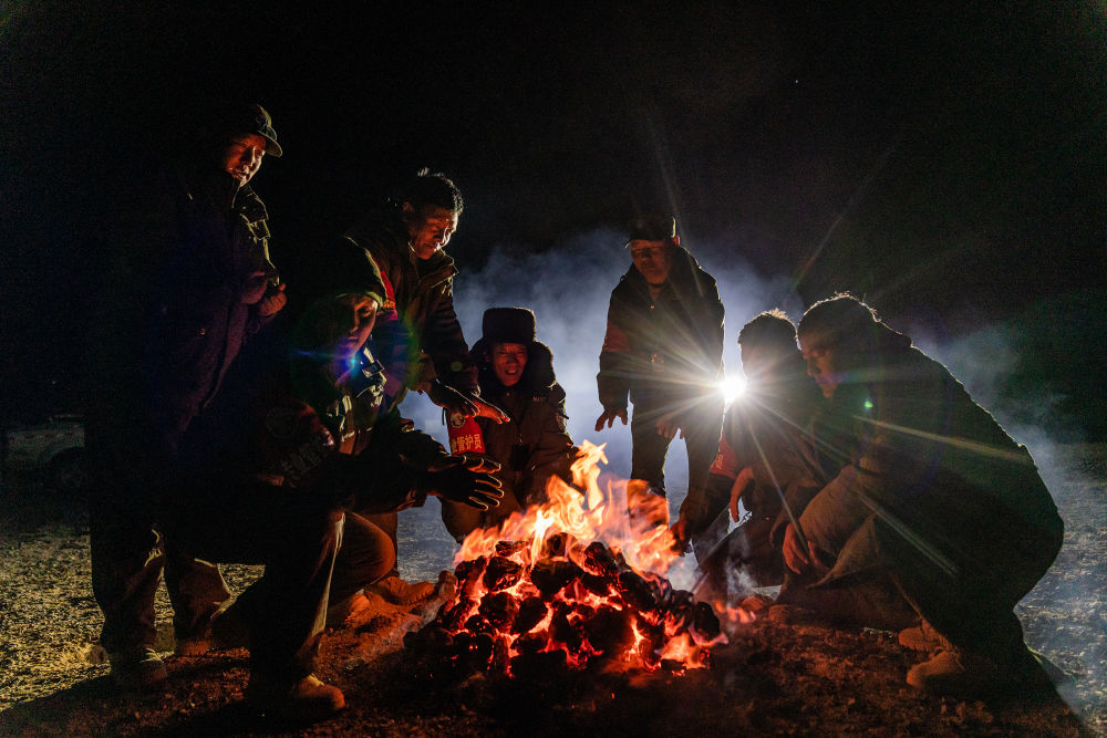 2024年5月10日,野生動(dòng)物專業(yè)管護(hù)隊(duì)員在西藏羌塘國(guó)家級(jí)自然保護(hù)區(qū)的宿營(yíng)地用野牦牛糞烤火取暖。