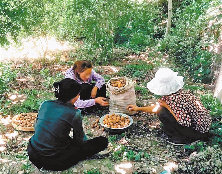 圖為左貢縣村民們正在收核桃。記者 萬慧 攝