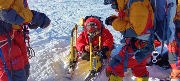 科考隊(duì)員用雷達(dá)測(cè)厚儀,在海拔8201米的卓奧友峰峰頂測(cè)量冰雪厚度(2023年10月1日攝)。 新華社發(fā)
