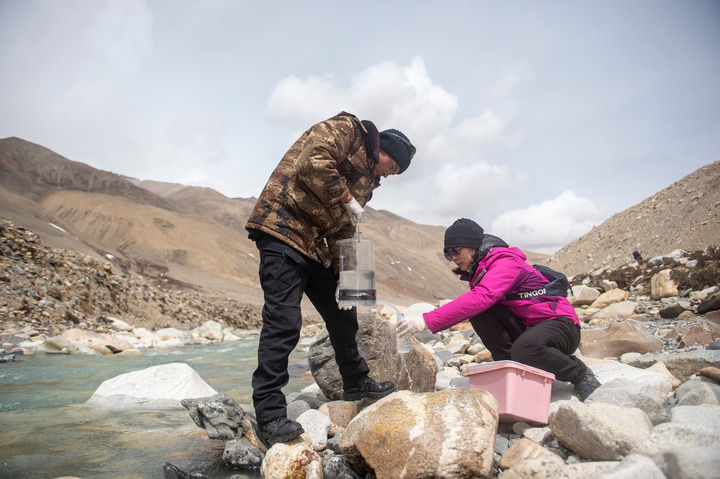 在東絨布冰川區(qū)域,科研人員在進(jìn)行微生物指標(biāo)水樣采集(2022年4月30日攝)。 新華社記者 旦增尼瑪曲珠 攝