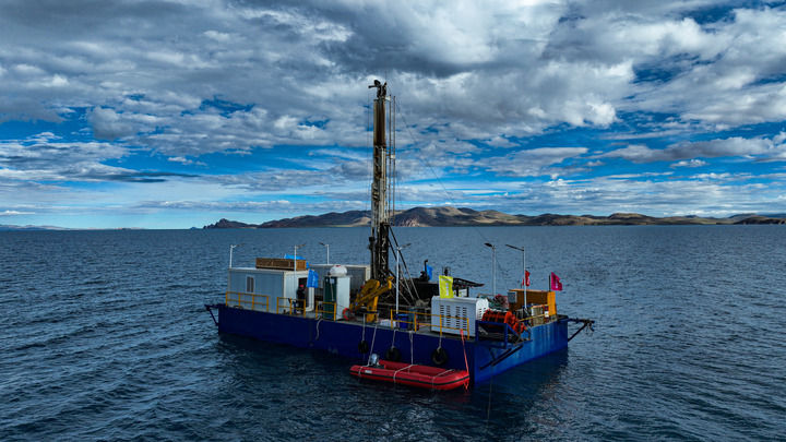 2024年7月11日拍攝的納木錯(cuò)水上鉆探平臺(tái)(無(wú)人機(jī)照片)。 新華社記者 晉美多吉 攝