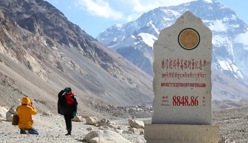 游客在珠穆朗瑪峰高程測量紀念碑前拍照留念。(受訪者供圖)